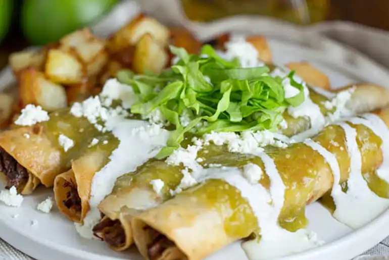 - 2 mini flautas, 1 chile relleno, tostadas, chicharrón, aguacate, queso panela, crema, limones, lechuga, rábanos, orégano, chile
